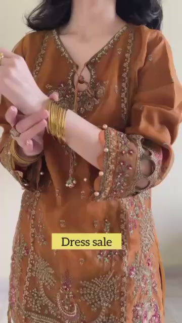 Step into a realm of timeless elegance with our Regal Tapestry Pishwas. This breathtaking, floor-length garment showcases a captivating interplay of textures and patterns. The upper bodice features intricate, floral embroidery in rich hues, creating a striking focal point. The pishwas then flares into a beautifully paneled skirt, with alternating panels of a complementary printed fabric, featuring traditional motifs in deep red and cream tones. The full, flowing silhouette exudes grace and movement, perfect for making a grand entrance. The long sleeves are also adorned with delicate embroidered details, adding to the overall regal aesthetic. Crafted for special occasions and celebrations, this pishwas embodies a sophisticated charm that blends traditional design with contemporary flair.